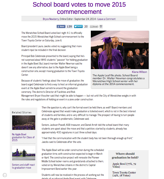 The Apple Leaf opened a poll to users and by the end of its run, it generated approximately 250 responses from students, faculty and parents when the school board voted to move the location of the graduation ceremony. The poll served as an excellent tool for engagement and gave another opportunity for readers to read the story.