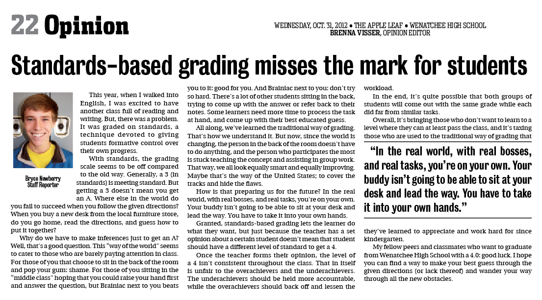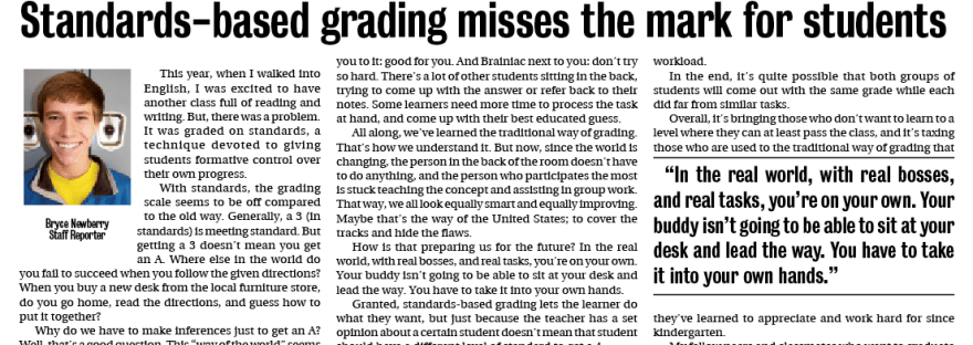 This year, when I walked into English, I was excited to have another class full of reading and writing. But, there was a problem. It was graded on standards, a technique devoted to giving students formative control over their own progress.
