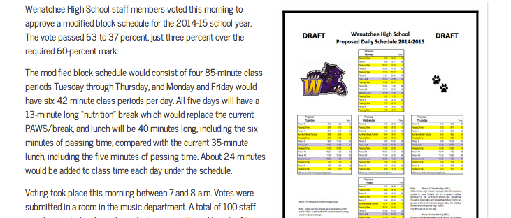 Wenatchee High School staff members voted this morning to approve a modified block schedule for the 2014-15 school year. The vote passed 63 to 37 percent, just three percent over the required 60-percent mark.