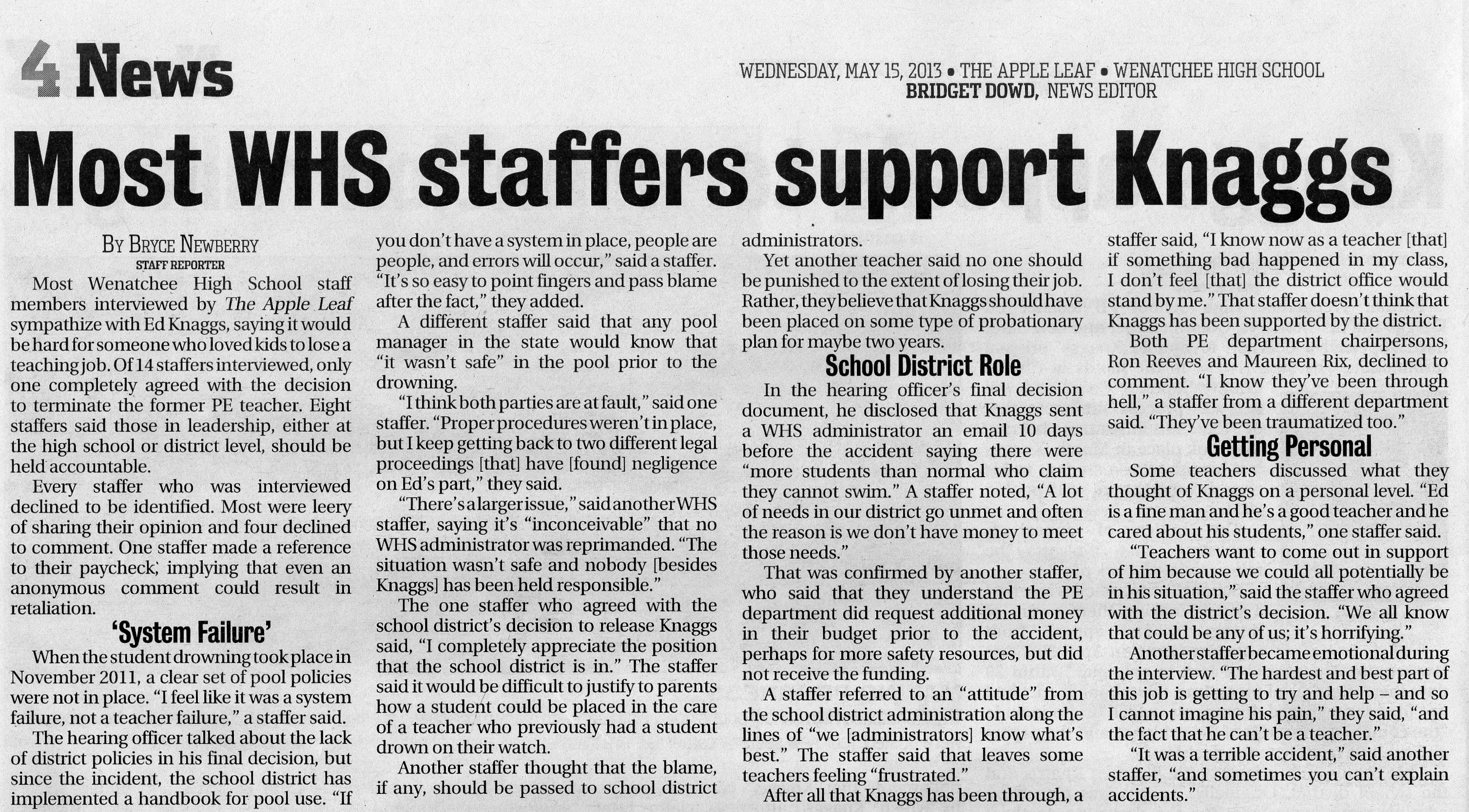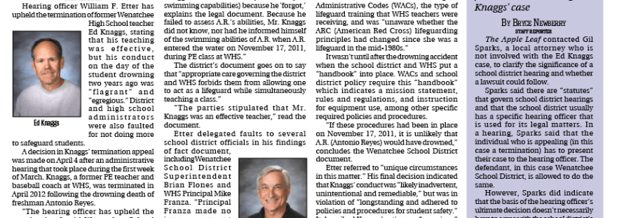 Hearing officer William F. Etter has upheld the termination of former Wenatchee High School teacher Ed Knaggs, claiming that his teaching was effective but his conduct on the day of the student drowning two years ago was “flagrant” and “egregious.” Blame for the drowning was also directed at district and high school administrators.